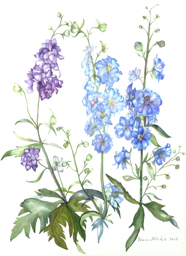 A new watercolor, size about 19″ x 24″ The summer has been just about perfect for growing good flowers of all kinds. I’ve always thought delphiniums were a horticultural tour de force, out of reach for all but the most skilled and ambitious gardeners. Some of the great beauties of the garden, however, so worth a try, since some nice plants appeared in a local nursery. Here is the result.