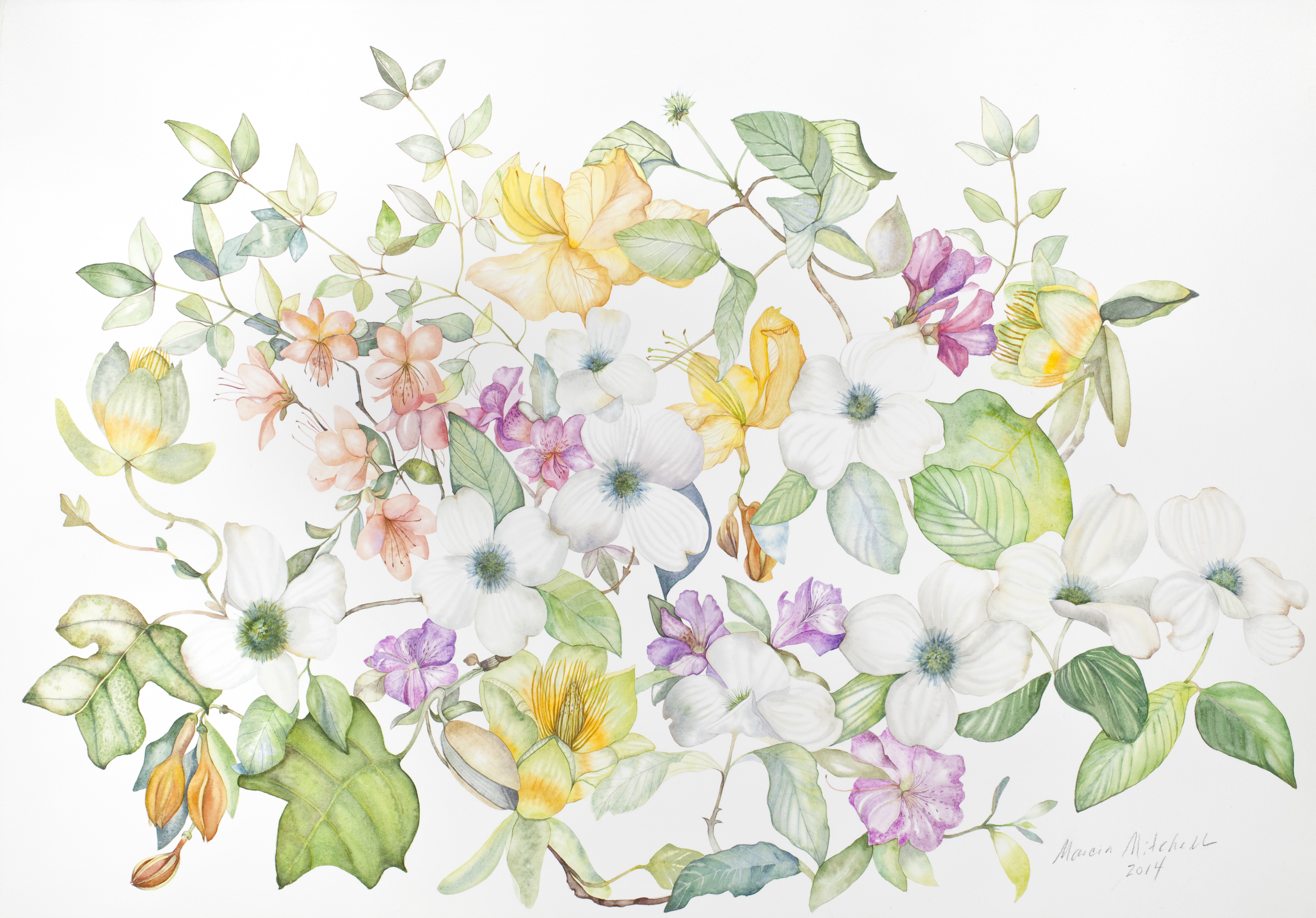 Dogwoods, that timeless favorite of spring, and azaleas, deserve lots of attention, and this spring I gave it to them. This a large painting for a watercolor, and painting at this size presents difficulties of many kinds. For instance, all the brushes need to be of different sizes than those used in “regular” watercolors, each image is larger and therefore the working area dries more slowly, and possibly unevenly. The number of flowers required to complete the planned painting is enormous. Many dogwood branches and azalea flowers went into creating this large painting, but, as Frida Kalho said, “I paint flowers so they will not die.”